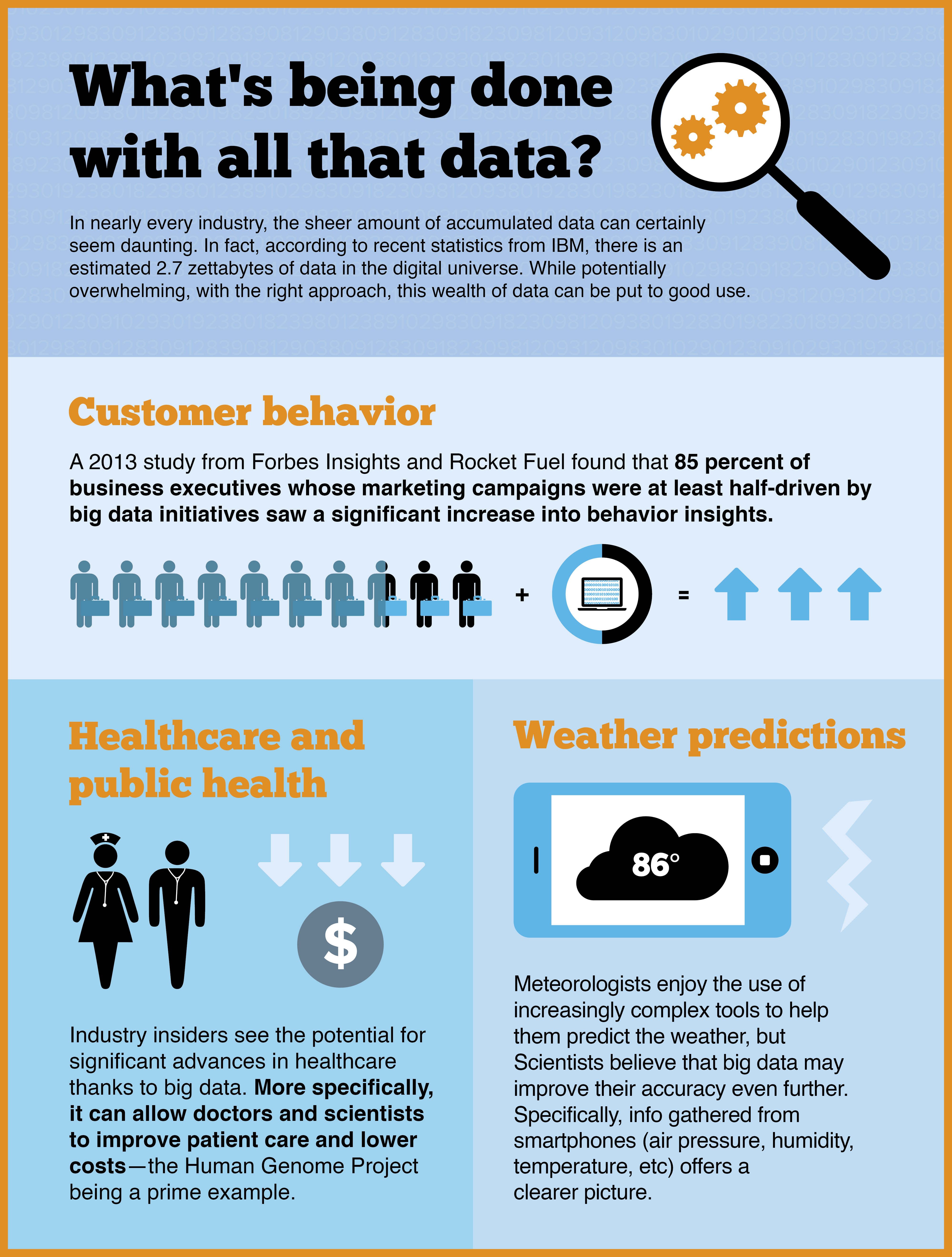 Marketing seems to be one facet where big data is having a direct and measurable impact. Approximately 85 percent of business executives whose marketing campaigns were at least half-driven by big data initiatives saw a significant increase into behavior insights. The benefits don’t stop in the marketing department, either. Take a look at this infographic provided by KYO Logic to see how else big data is being used on a daily basis.